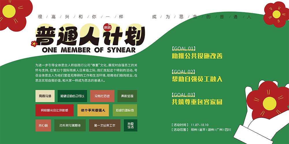 為進一步傳播針對自強員工的“尊重”文化,引導全體思念人積極踐行“尊重”文化,展現對自強員工的關懷與支持,在第32個國際殘疾人日來臨之際,思念食品組織開展了面向全國各生產基地的自強員工關愛活動,號召全體思念人為他們營造無障礙的工作和生活環(huán)境,助推他們穩(wěn)崗就業,在思念實現自我價值,和大家一樣成為思念的普通人。